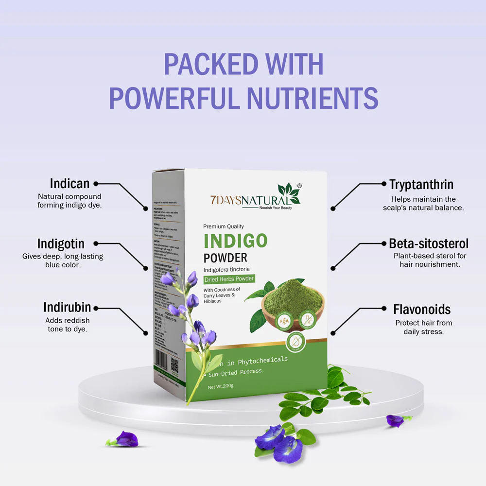 Nourish Your Beauty naturally with 7Days Natural Indigo Powder, made from pure Indigofera tinctoria leaves using a sun-dried process that retains all the essential phytochemicals. This dried herbal powder is enriched with the goodness of curry leaves and hibiscus, making it ideal for natural hair coloring and scalp nourishment.