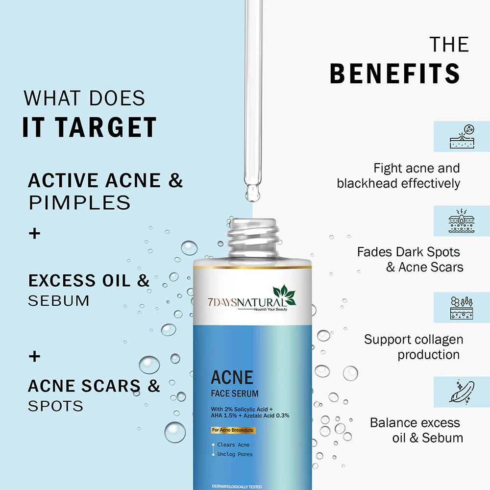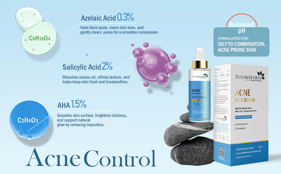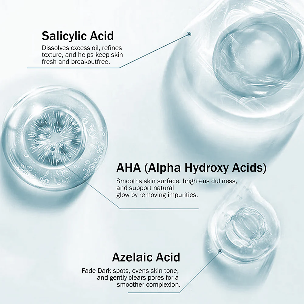 - ACTIVE INGREDIENTS:Â Contains 2% Salicylic Acid, 1.5% AHA (Alpha Hydroxy Acid), and 0.3% Azelaic Acid for effective acne treatment.