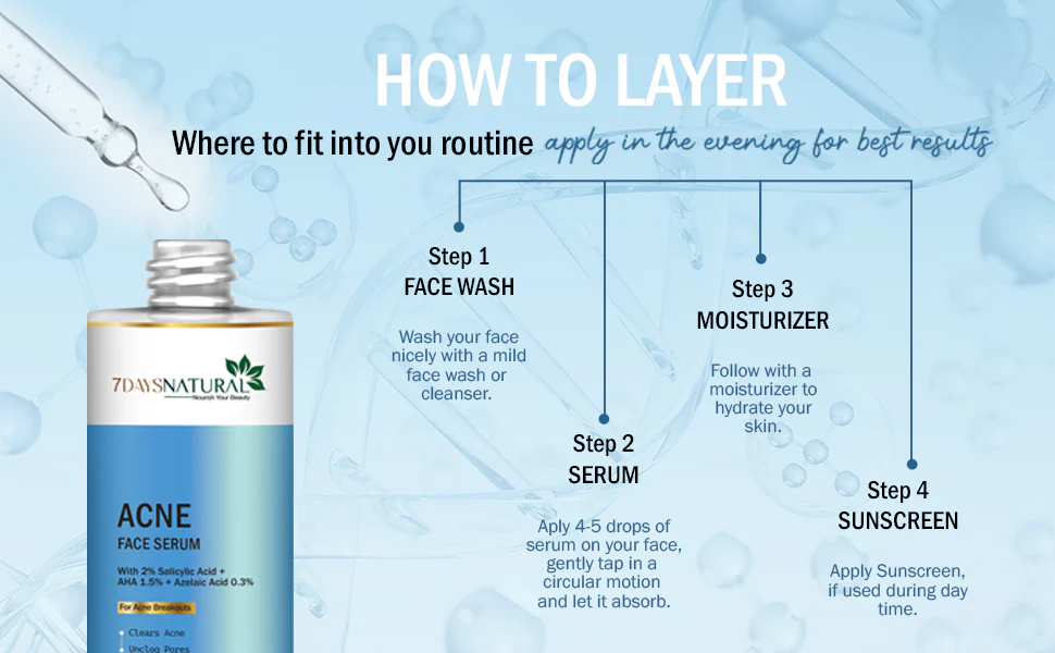 Transform your skincare routine with this powerful acne-fighting face serum. Formulated with a potent blend of 2% Salicylic Acid, 1.5% AHA, and 0.3% Azelaic Acid, this serum works effectively on oily to combination skin types prone to acne breakouts. The balanced pH formula helps unclog pores and promotes gentle exfoliation for clearer, healthier-looking skin. This 30ml serum features a convenient dropper applicator for precise application. Perfect for those struggling with acne concerns, the serum helps reduce the appearance of blemishes while supporting overall skin clarity. For best results, apply 4-5 drops to cleansed face, focusing on problem areas. The dermatologically tested formula is suitable for regular use and can be incorporated into both morning and evening skincare routines. The serum’s lightweight texture absorbs quickly without leaving any greasy residue, making it an excellent addition to your daily skincare regimen.