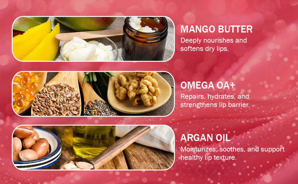 - NATURAL INGREDIENTS:Â Enriched with nourishing Mango Butter and Argan Oil for deep moisturisation and lip care.